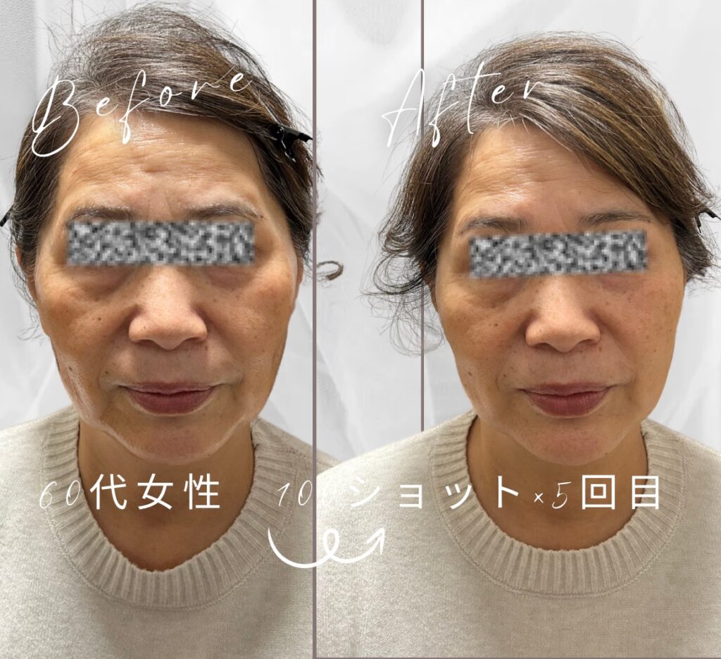 年齢とともに深まる目元や口元の影。施術を重ねることで、お肌の内側から押し返すような弾力が生まれ、お顔全体がキュッと引き締まった印象に整いました。