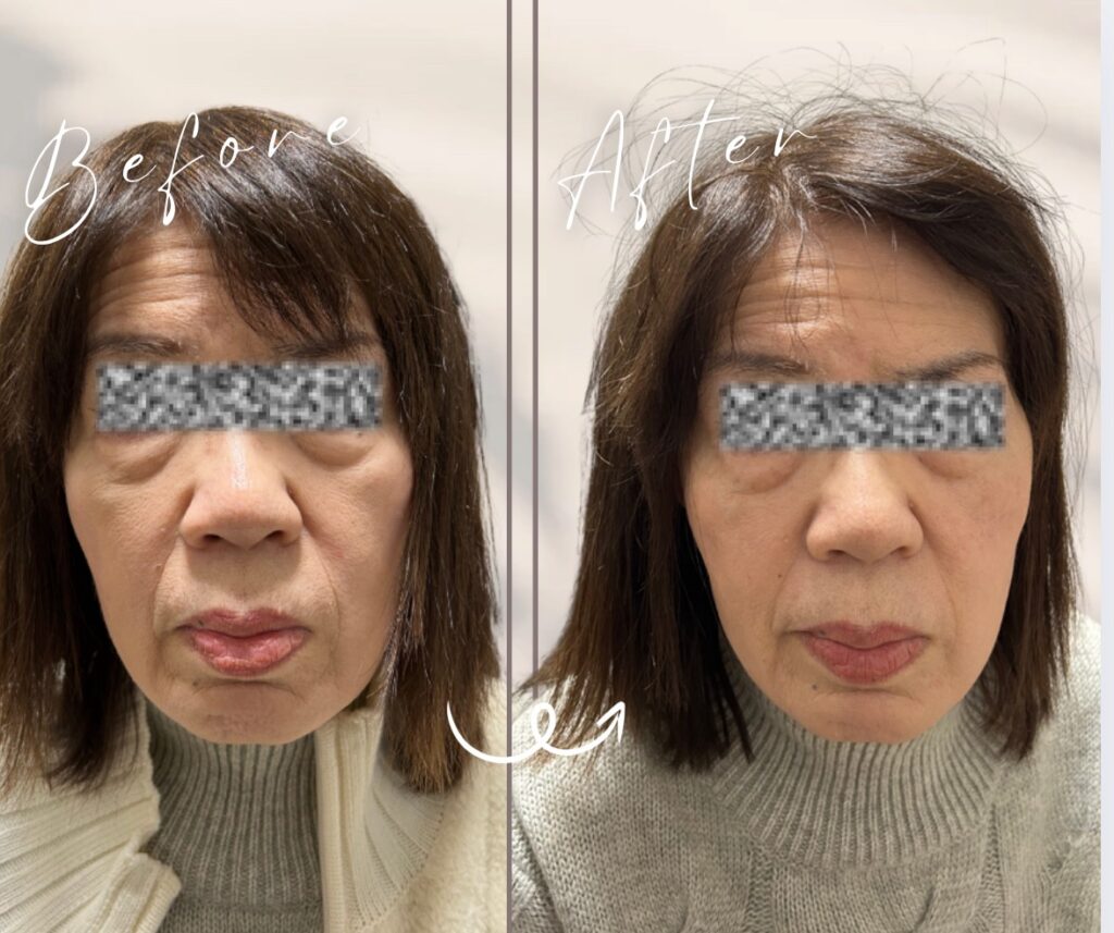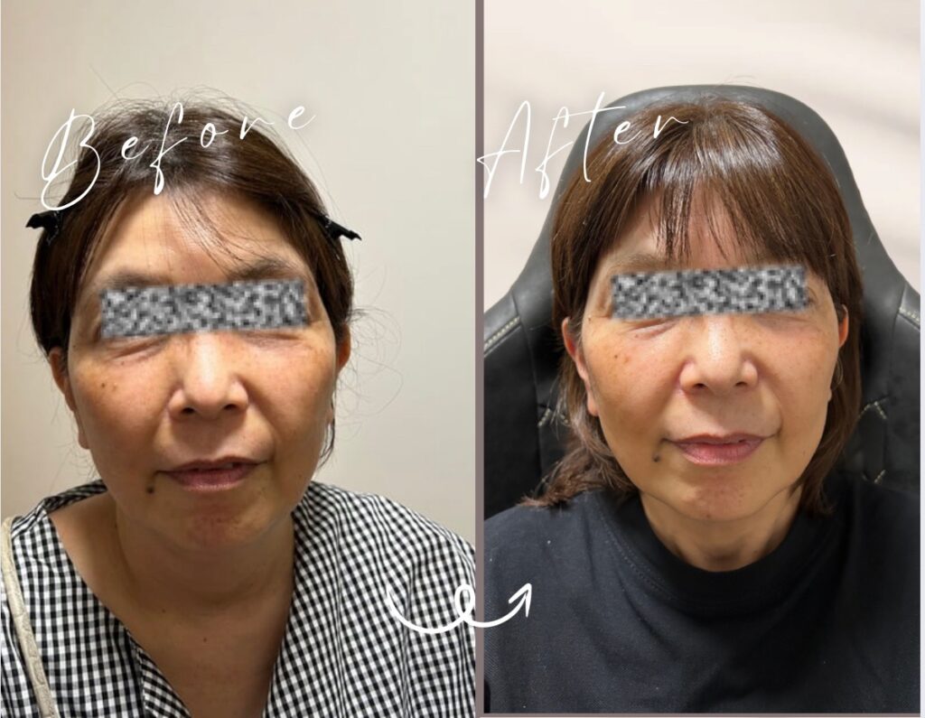 顔全般の施術後、頬のたるみが改善され顔全般のリフトアップ、ほうれい線のシワが薄くなった