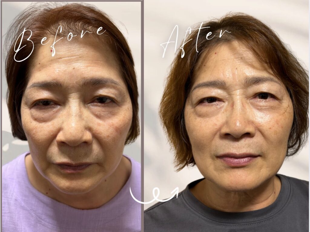 施術後1日後、目の疲れが取れて日が経つにつれ目の下のたるみが引きあがってきた。